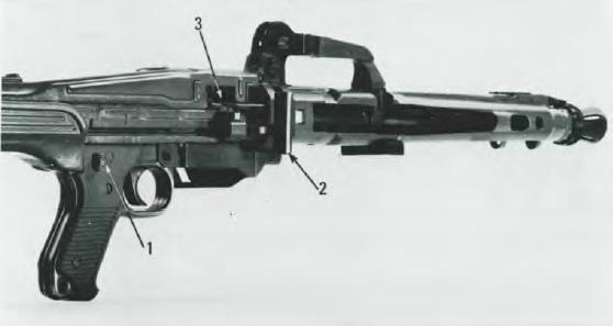 它特別的快速更換式風吹冷桶式槍管配有開槽閃光抑制器。這種槍管有一個鍍金屬襯裡的散氣孔,有6個右手凹槽和178毫米(1:7英寸)的槍管線扭曲率,適用於較重的SS109 5.56×45mm NAT FA。還提供一個305毫米(1:12英寸)扭轉率的槍管,專門用於穩定輕量級M193彈藥發射時的力度。槍管的腔室部分具有有助於提取順序的凹槽;一旦孔中的氣體壓力下降到安全水平,再循環氣體填充盒殼體周圍的凹槽,將殼體從腔室壁上鬆開,而筒體中的殘餘壓力迫使其向後和向前噴射。固定的解除用提手位於腔室附近的槍管上方,當槍管變得太熱時有助於槍管更換; 可以在5秒內取出並更換槍管。