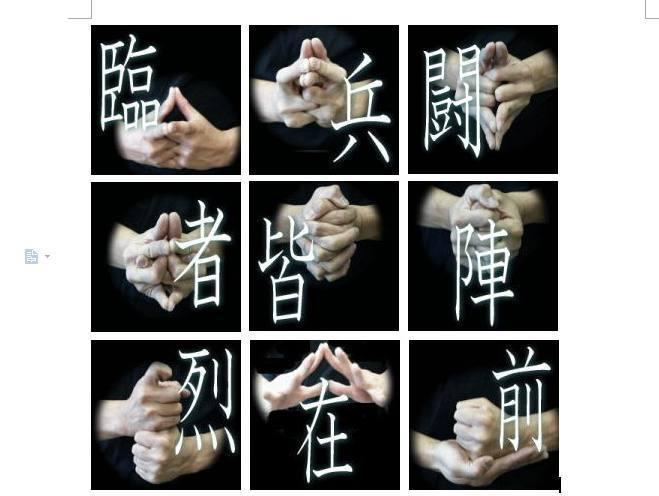 九字源自東晉葛洪的「抱朴子」內篇卷篇登涉篇,云:「祝曰:「臨兵斗者,皆數組前行,常當視之,無所不辟」。意思是說,常念這九個字,就可以辟除一切邪惡。東密受到我國道教的影響(使用護咒法),可是在抄錄這九個字時,把「數組前行」誤抄成「數組在前」或「陣裂在前」,而沿用至今。這九個字分別的意思是: