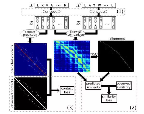 同時,該模型預測了每次嵌入的「接觸圖」(contact map),即每個氨基酸與該蛋白質中其他氨基酸的距離,並將其預測的接觸圖與來自SCOP的已知接觸圖進行比較,然後向編碼器發送反饋信號。這一步驟有助於模型更好地明確氨基酸在蛋白質結構中的確切位置,從而進一步瞭解每個氨基酸的功能。