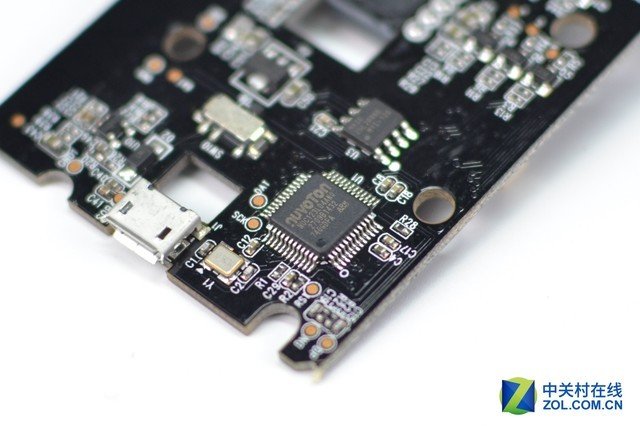 底部PCB板另一面同樣有兩顆重要的晶片,分別為微控制器和快閃記憶體。其中微控制器靠近microUSB接口,來自新唐,型號為NUC123LD4AN0。這是一顆ARM Cortex-M核心處理器,處理速度為72MHz。這顆微控制器是雷柏VT350的大腦,處理各種信號。這顆微控制器型號與雷柏VT950上的一致;
