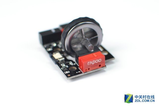 雷柏VT350的左右按鍵對應的微動為紅色,比較醒目。從標識上能看出其來自凱華,不過是雷柏定製款,所以整體手感與傳統凱華紅點稍有區別。這個微動可實現6000萬次開關,壽命非常長。而且由於是雷柏定製,所以整體手感更加清脆、觸發回彈迅速,手感出色。