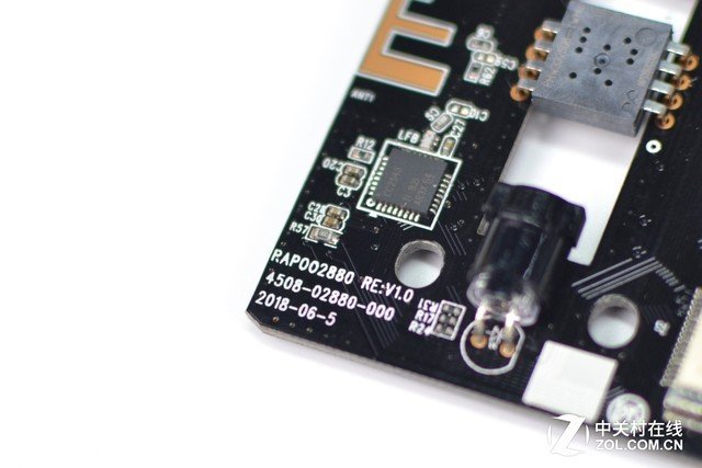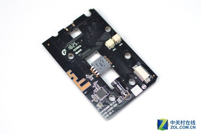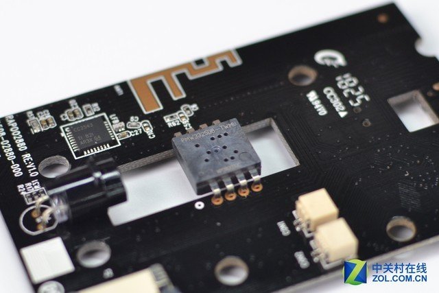 底部PCB板採用黑色塗裝,表面非常乾淨整潔,布局合理,有大廠風範。正面可見重要零件為中央的光學引擎和位於主板編碼旁的射頻IC。