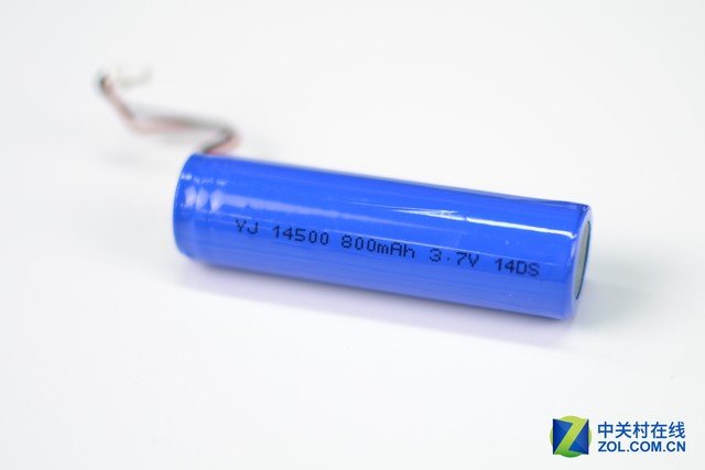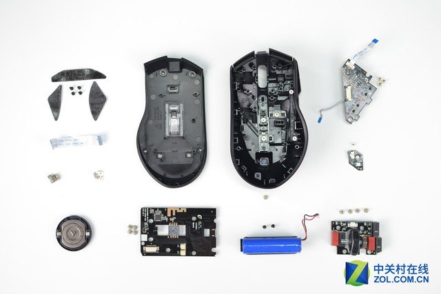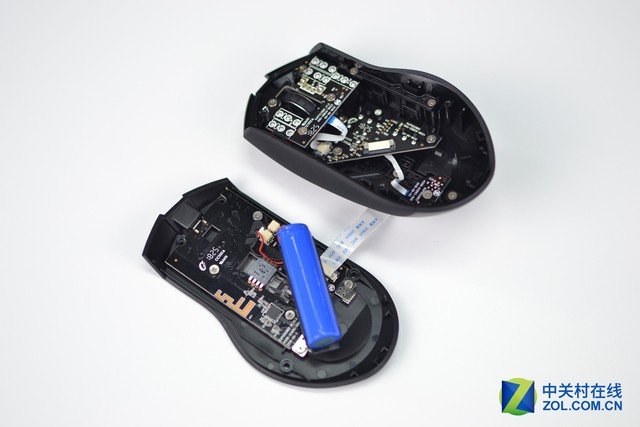 先看底部部分。電池斜放在PCB之上,有排線與PCB相連。電池容量為800mAh,電壓3.7V,電池類型為14500鋰電池,可循環充放電。800mAh在內置電池的無線滑鼠中算是容量較大的,而且電池還可以起到加重效果。