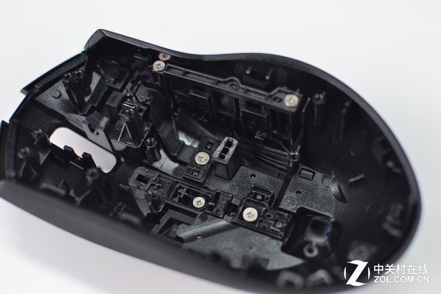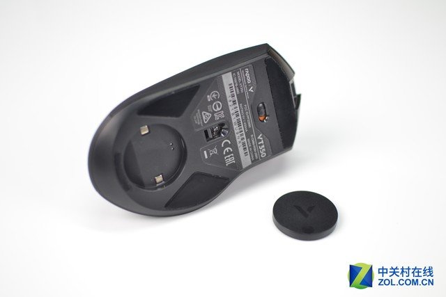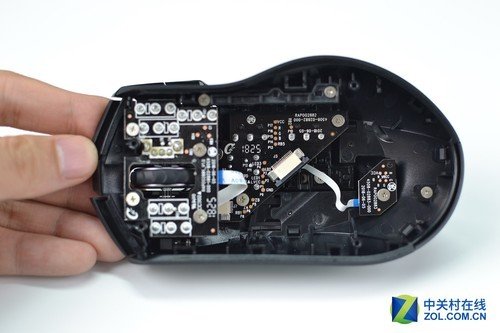 由於定位中端,所以整個拆解過程要比雷柏VT950容易一些。首先將滑鼠切到關閉狀態,取下配重塊。雷柏VT350的底部螺絲分布在三個墊腳下面,共4顆螺絲。取下螺絲即可打開滑鼠。打開時要慢一些,裡面有一條排線連接上下PCB板,需要注意一下。
