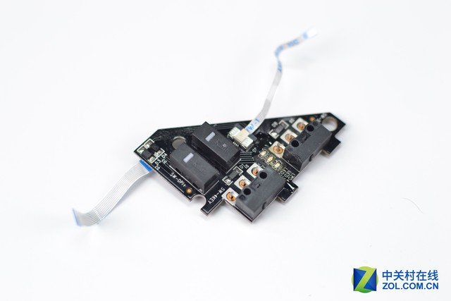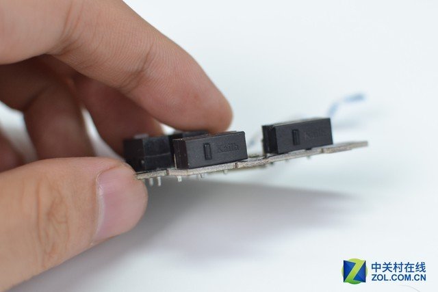 在下面的PCB板上,還有四個微動,其分別對應DPI+-和側鍵。其中DPI+-對應的微動為凱華白點,其與上面提到的微動一致;側鍵對應的微動為凱華黑點,手感相比白點更加清脆一些。