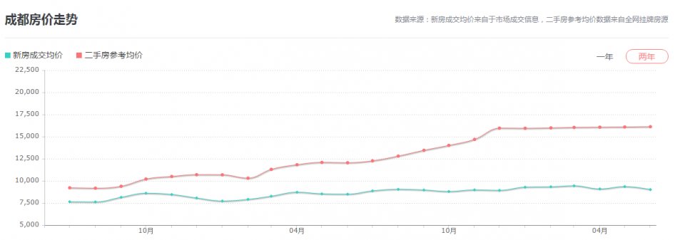 6月成都二手房掛牌均價為16121元/㎡,環比微漲0.21%,同比上漲33.87%;新房均價9010元/㎡,較5月的9348元有所下跌。從上述成都近兩年房價走勢圖可以看出,新房價格自今年1月開始溫和下跌,二手房掛牌均價則保持了較快的發展勢頭,從2月開始房價漲幅趨緩,至今年6月達到最高點,為16087元/㎡。