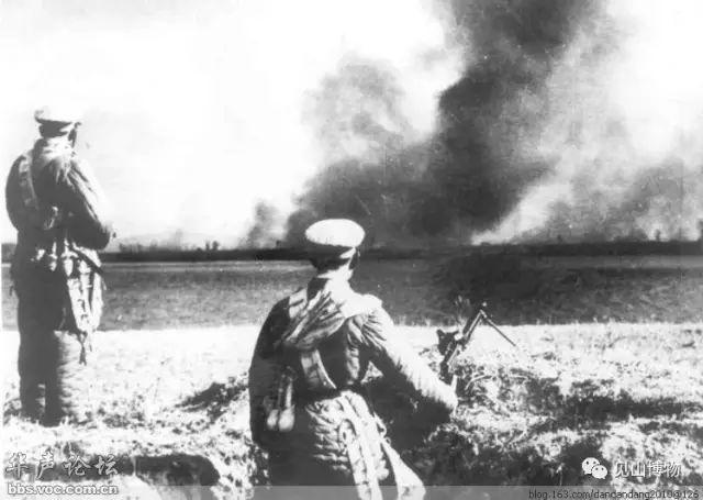 1950年,兩名裝備十一年式輕機槍的解放軍邊防兵從鴨綠江中國一側眺望朝鮮,對岸因轟炸而生成的濃煙即為美軍轟炸機的「傑作」