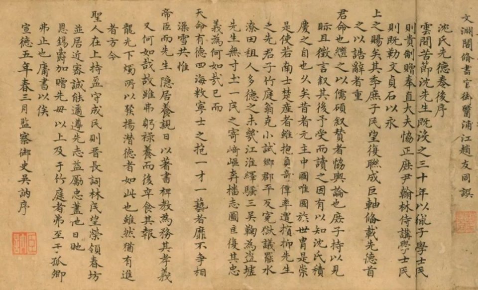 吳歷,字漁山,為永樂朝右副都御史吳訥(1372—1457)的十一世孫,故宮博物院藏明代鄒緝等七家《行楷書華亭沈氏先德記》卷(注1)後有吳訥宣德五年(1430)小楷所書《沈氏先德卷後序》(圖1)。此卷是沈度(1357—1434)為紀念祖父沈德輝(字煥卿,號竹庭翁)之名德而請鄒緝作《沈氏先德記》,其後唱和者有曾啓、梁灒、胡儼、李貫、趙友同、吳訥。吳訥治學勤勉,為官敬慎廉直,得沈度提攜。《明史》記:「洪熙元年,待讀學士沈度薦訥經明行修,授監察御史。」(注2)從吳訥傳記可知,吳歷的勤奮好學和喜結雅士得傳吳訥家風。