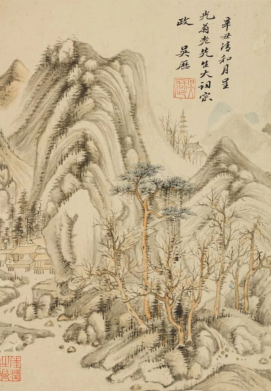 2.吳歷,《仿古山水圖》冊,清,紙本設色,27.5×18厘米,上海博物館藏
