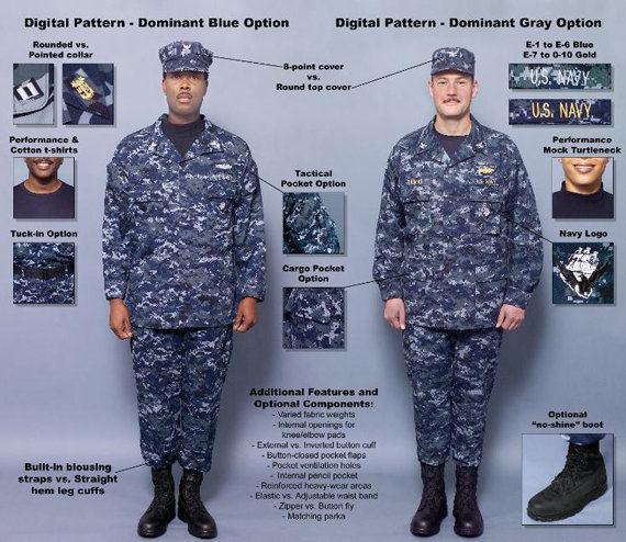 官方名稱為海軍工作服(NWU),數碼迷彩NWU是由尼龍和棉製成的更加舒適和耐用的工作服。海軍工作服代替了艦上、海岸粗棉布條紋襯衣工作服、耐洗滌卡其色連體服、林地綠、航空兵綠、冬季藍色工作服和熱帶工作服。工作服的常態穿著壽命被設計為最多18個月,相比先前老款工作服的6個月穿著壽命長了很多。