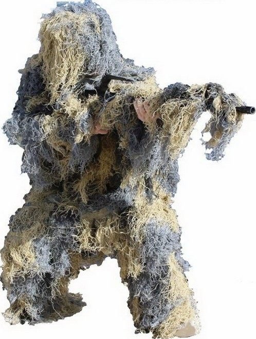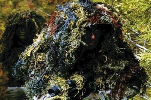 這種偽裝服的材料以麻繩和棉線為主,適用於草原、平原或草叢較多的任務環境,在樹林或樹叢里也有不錯的偽裝效果。