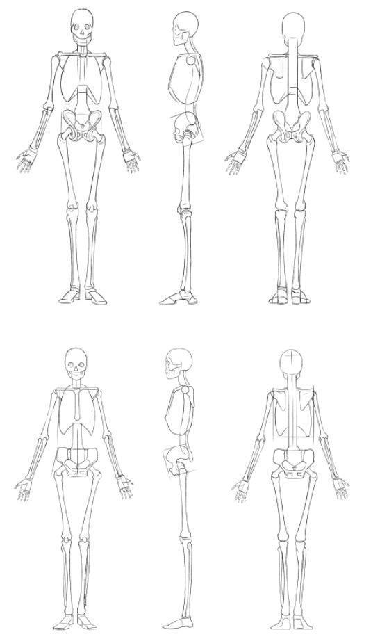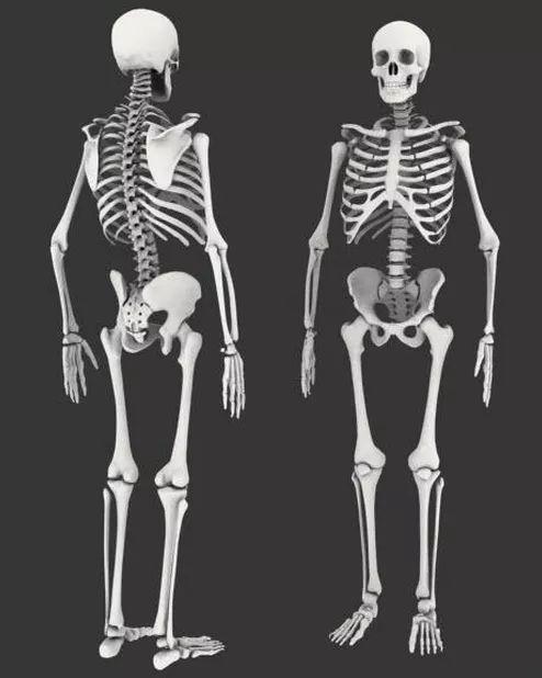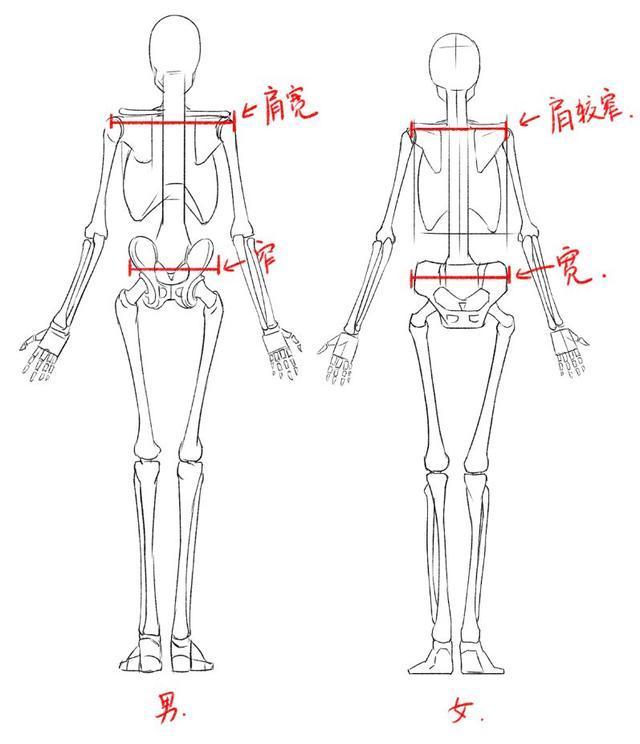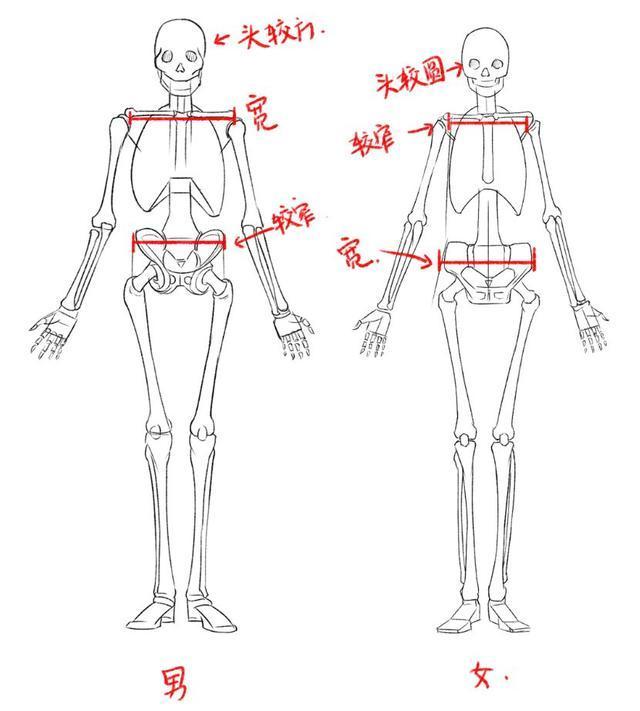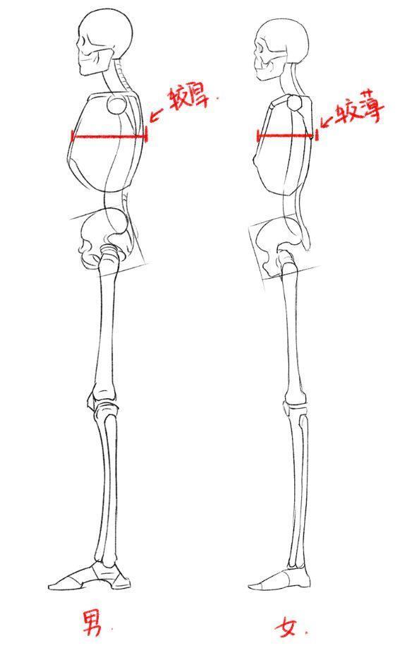 上面是人體骨骼通常的畫法,但是男女骨骼之間存在一些決定性差異,來區分開男性和女性的外表。