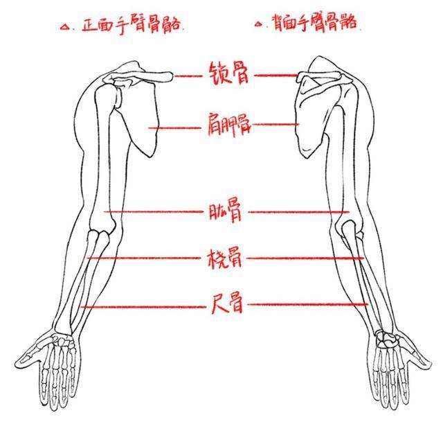 我們平時畫人,體現鎖骨就只有在領口畫一點輪廓,但是在人體中,鎖骨是長到和肱骨(上臂的骨頭)連在一起的。
