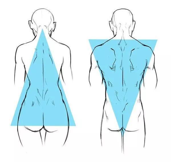 肩部與胯部的關係還是一樣,男性的軀體可以看成倒三角,女性的像正三角。