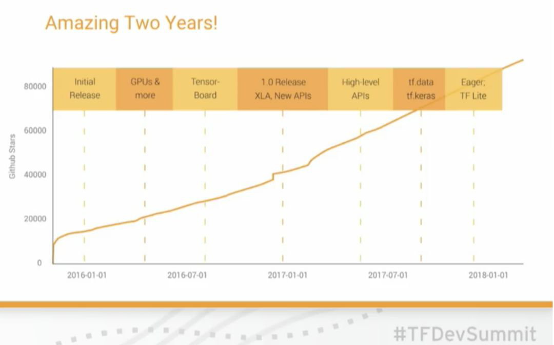 據介紹,在過去的兩年中,TensorFlow 不斷更新,不斷改善,逐漸成爲社區內最爲流行的深度學習框架。下圖是從開源以來,TensorFlow 的重大更新,例如 TensorBoard、tfdata、tfkeras、Eager Execution 等。