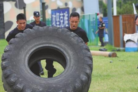兩名隊員合作翻滾300斤的輪胎。