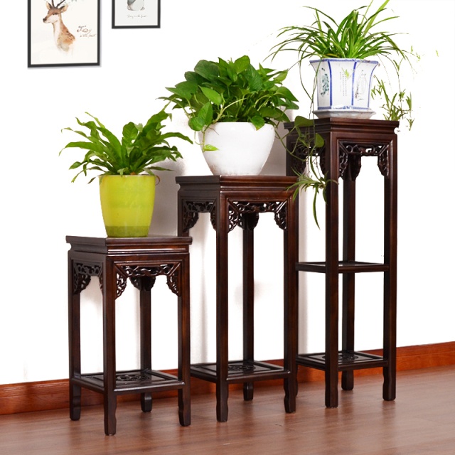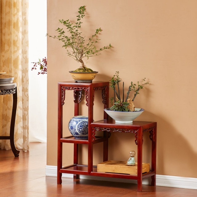 中式多層實木榆木花架,使用實木打造而成,仿古式的設計,享受古典美感,雕刻鏤空的花紋,精緻細膩,多層的設計,更充分的擺放植物。