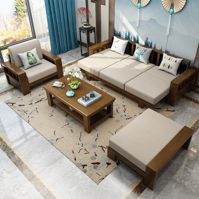 純實木的新中式水曲柳沙發床,明清時代感的沙發藝術,古典氣息的美感,設計穩固的沙髮腳,純實木質地,健康環保,充滿異域風。