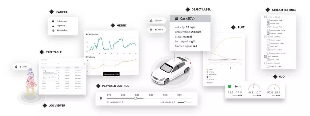 技術創業公司 Drive.ai 也曾在 2018 年介紹過 4 款可視化工具(儀表板顯示器、3D 數據可視化、註釋數據集以及交互式模擬),但也只供內部工程師使用。
