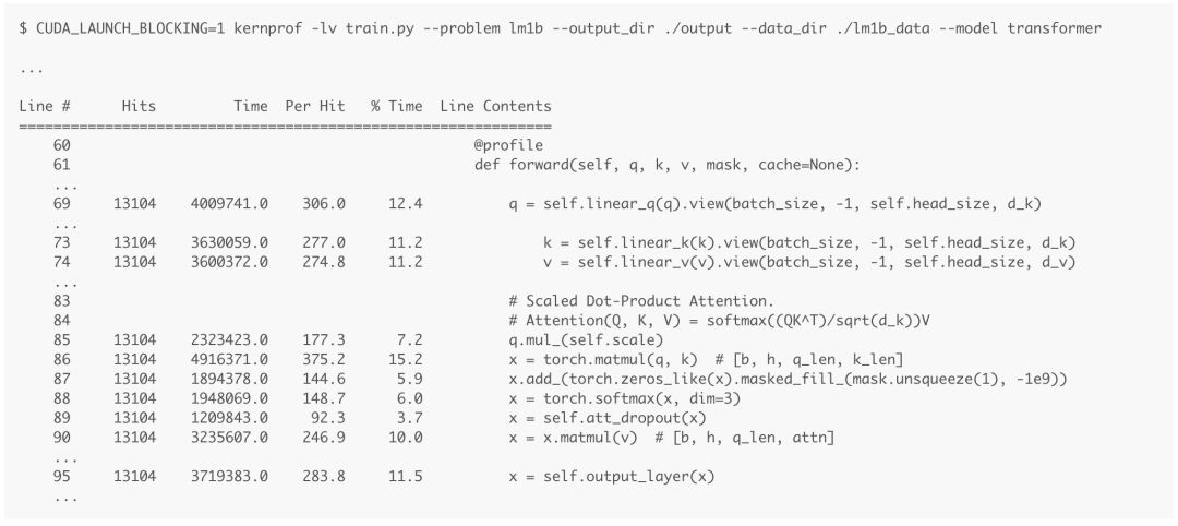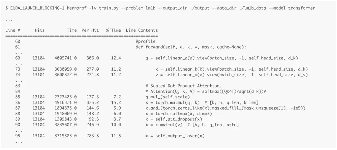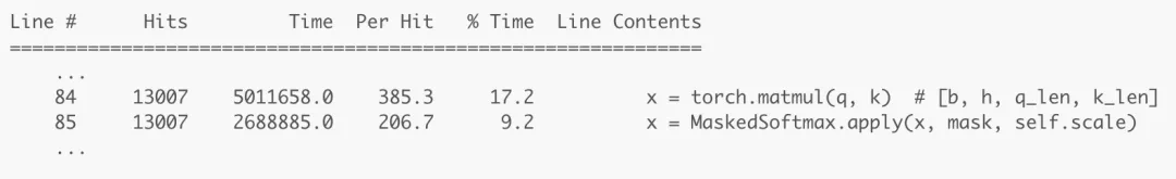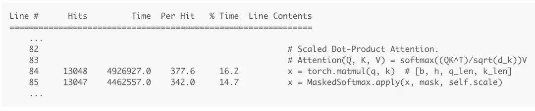 運行一個 epoch 的後分析多頭注意力機制前饋函數的結果如上圖所示。結果顯示了測量每一行所花費的時間,因此我們可以很容易地找到需要優化的目標代碼。我們將重點關注第 85、87 和 88 行中的掩碼操作。它組合了多個操作符來模擬「掩碼處理後的 softmax」操作:爲 softmax 的掩碼輸入填充負無窮數,從而使 softmax 忽略它們。在本文中,我將嘗試優化這些操作。請注意,它當前花費了函數執行時間的 19.1%(7.2 + 5.9 + 6.0),而第 86 行花費了 15.2% 的執行時間。讓我們使用這個值作爲對比基線。