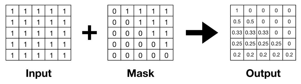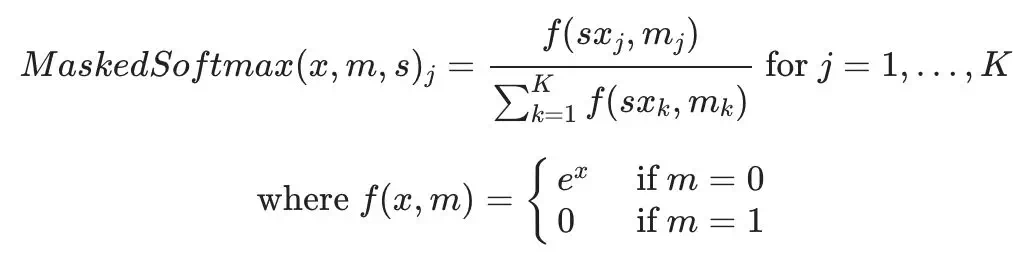 x 是一個softmax 函數數的輸入張量,m 代表一個掩膜張量,s 是一個用於歸一化的標量值。該方程與 softmax 類似,只是掩碼處理後值被規定爲零,並乘以歸一化係數。下圖顯示了掩碼處理後的 Softmax 的一個示例。掩碼處理後的位置變爲零,並且使用 softmax 計算出其餘位置上的值。