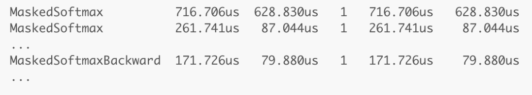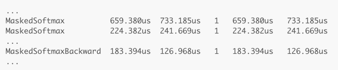現在,內置的 PyTorch 分析器也顯示出了這個自定義操作符的性能提升。因此,由於逐行的分析器需要用太長的時間進行性能分析,我將這個第一版的掩碼處理後的 softmax 用作進行進一步優化的對比基線。