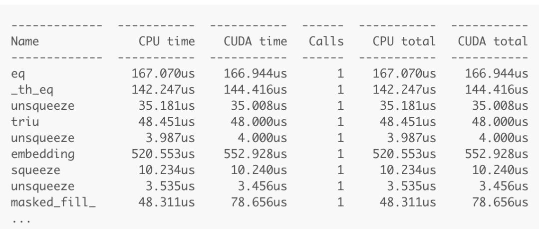 分析器顯示出了每個操作符在 CPU 和 GPU 上花費的時間。分析結果很直觀,並且看起來似乎很精確,但是我們很難分辨出每個操作符並將它們與我的源代碼匹配起來。例如,上面的輸出結果顯示出了三個不同的「unsqueeze」操作符,但是我們並不知道它們是在哪裏被調用的。因此,我轉而使用其它的分析器來尋找性能的瓶頸點