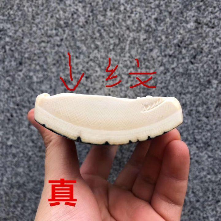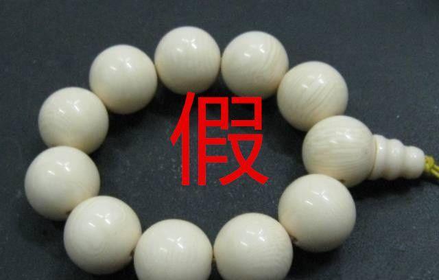 目前市場上常見的象牙假冒貨,主要是為骨製品、獸牙、魚牙或其他相仿材料。用骨製品冒充象牙的主要有牛骨、馬骨、駱駝骨等;獸骨在未經過加工之前,其顏色和光澤與象牙迥然有別。骨的色澤偏灰,色調晦暗,無象牙色澤的那種溫潤之感。所以,造假者往往要先將獸骨經過漂白處理,再磨光上蠟。但是經過漂白磨光的骨雕即使加工處理再好,也總免不了遺留少量極細微的黑斑點,這是骨質的特質,俗稱「骨眼」。只要在放大鏡下驗看,一定能發現「骨眼」。因此,在辨別時,我們只要把握住象牙的「牙紋」,骨雕的「骨眼」就能夠較好的辨別猛獁象牙製品的真假。