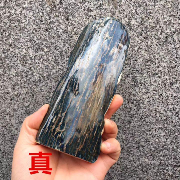 製品表面呈深褐色或藍色,已礦化,說明深埋地下近萬年;表現在部分成品上為保留牙皮,呈現厚重與復古產品色。