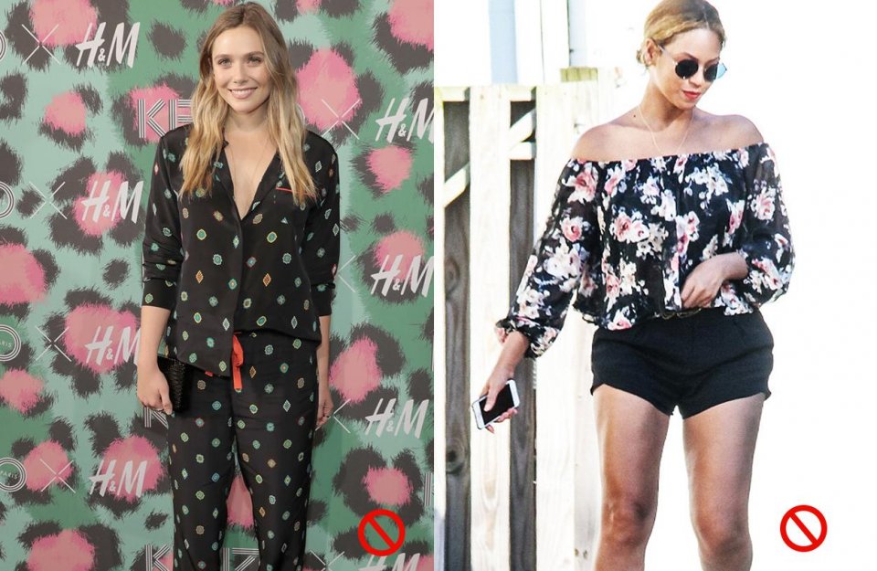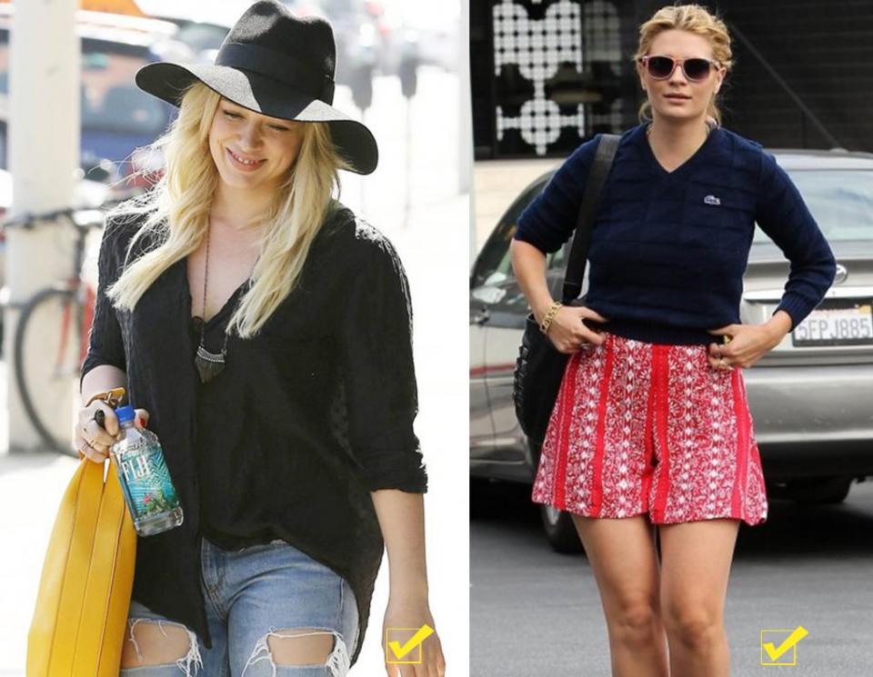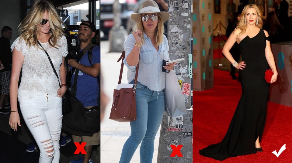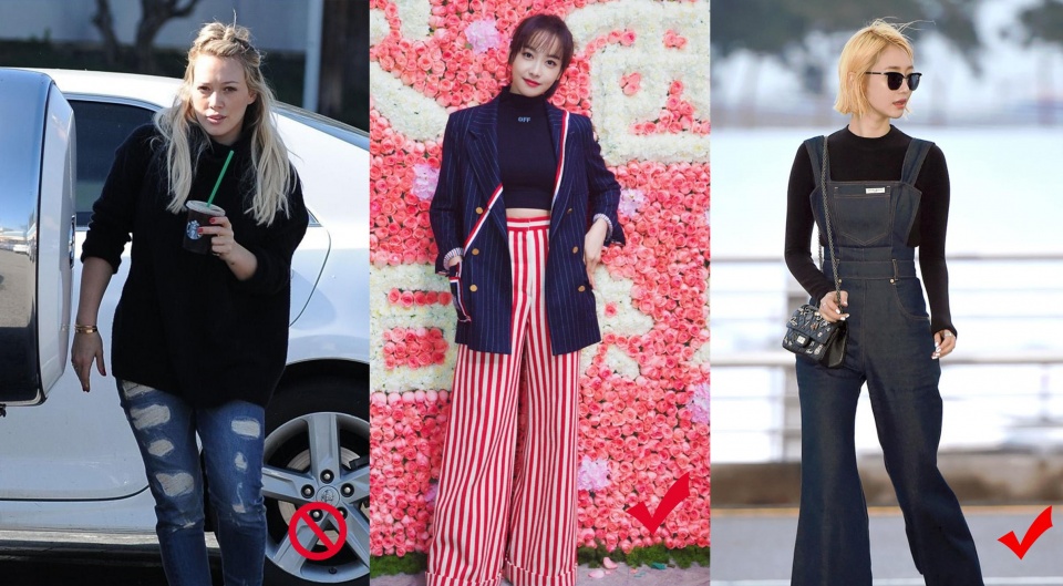 褲裝方面有紋理圖案的也同樣具有這樣的效果,但是款式儘量要有一定維度的,例如圖中緊身的牛仔褲和圖右兩款有圖案的闊腿褲相比,有外擴設計的更具有包容性,能夠揚長避短的同時也起到了轉移視線作用。