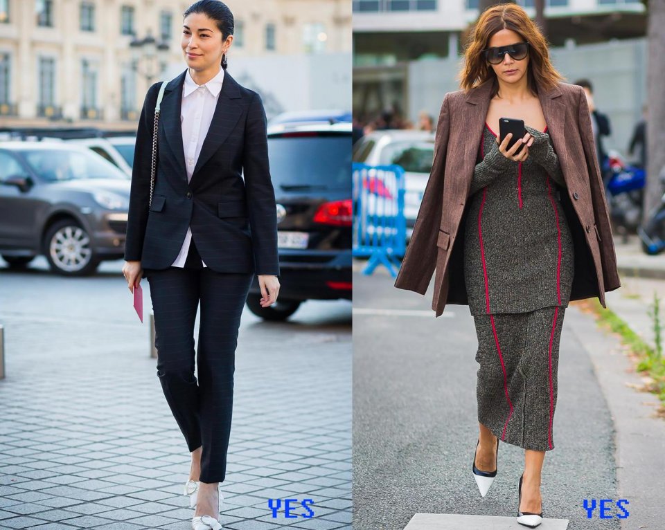轉移腰線可以理解為提高腰線,但是蘋果妹切記要避免像圖左那樣勾出深深的腰線,那樣只會更為凸顯你腹部的贅肉,而適當的轉移腰線加上合身版型的西裝套裝,讓你的簡約里充滿了大牌范。