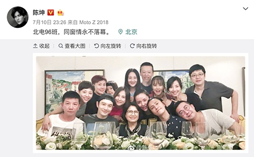 近日陳坤深夜在網絡po出了一張他和96級同學還有班主任崔新琴一起聚會吃飯的照片。他還發文寫道到「北電96班,同窗情永不落幕。」只見照片中黃曉明和陳坤分坐在班主任崔新琴老師的左右,面帶微笑,整個聚會的氣氛給人感覺其樂融融。