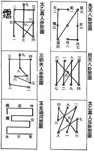 禹步之法,先舉左足,一跬一步,一前一後,一陰一陽,初與終同步,置足橫直,步如丁字,以象陰陽之會。這種三步九跡,寓意三元九星、三極九宮,以應太陽大數。禹步是法天地造化之象,日月運行之度。道教認為禹步百日,誦詠斗章,可以與神潛通。