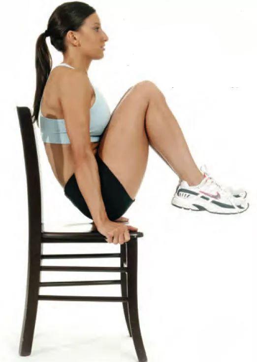 D.保持脊柱中立位姿勢,兩手撐著椅子,慢慢將兩腿放下,回到起始姿勢。上述動作15次為一組,重複做2組。