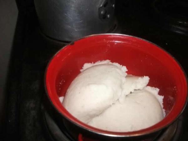 非洲人的吃法是將玉米磨成玉米粉,將一鍋水煮開,然後慢慢將玉米粉倒入,邊倒玉米粉,邊用木勺朝一個方向攪拌,讓玉米粉平均散開,最後慢慢凝結成團狀玉米糊。