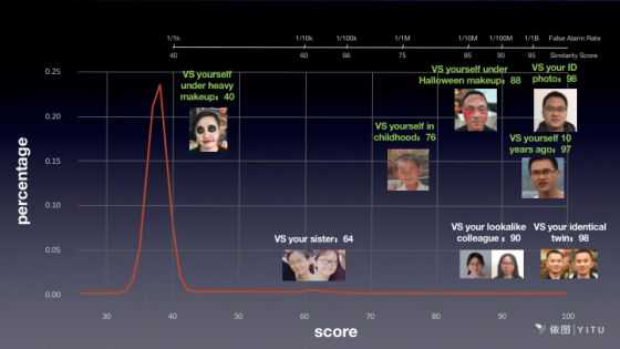 這就引發了另外一個問題:我們人類自身的識別能力的規模和精度,到底是什麼程度的?朱瓏在現場展示了下面這張相似度分佈圖: