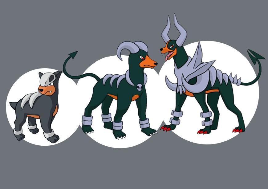 戴魯比,惡系與炎系屬性的寶可夢,它看起來像是一隻黑色的狗,背上有兩條條紋。因為它的屬性與外形,所以有的翻譯把它叫做暗犬或者惡魔犬。黑魯加,戴魯比的進化形態,屬性也是惡系加上火系。它的外形看起來像是頭上長了彎角的大型犬類,然後脖頸與背上都被淺灰色的骨狀物體環繞,還有一條像惡魔的箭頭形尾巴,所以有的翻譯將它譯為地獄犬。黑魯加是位數不多可以mega進化的寶可夢之一,mega進化後屬性不變,在外形上,它好像穿上了一件盔甲一般,看起來非常霸氣。