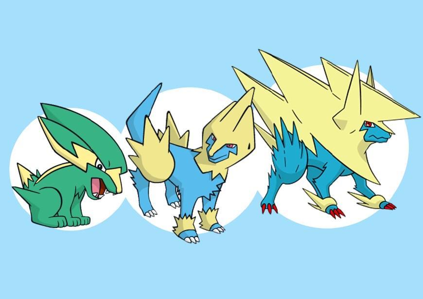 落雷獸是電系屬性的寶可夢,全身顏色以綠色為主,並伴有黃色的條紋,樣子像只小狗,能藉由與空氣摩擦來產生電力,所以有的翻譯把它叫做落雷狗或者電氣狗。雷電獸是落雷獸的進化型,屬性依舊是電系,身體的顏色則變為藍色與黃色為主了。因為它的外形十分接近大型犬類,所以有民間譯為電光狗。雷電獸同樣可以進行mega進化,mega進化後它的屬性保持不變,但身上的毛髮發生巨大變化,腦袋上和身體兩側的黃色鬃毛將身體上半部分給覆蓋了,看起來有的滑稽。