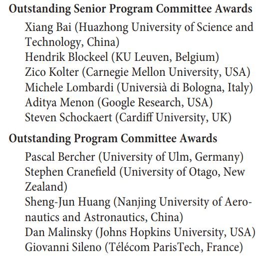 今年 AAAI 選出了 10 名獲獎的程序委員會成員,其中來自華中科技大學的白翔被授予傑出高級程序委員會獎,來自南京航空航天大學的黃聖君被授予傑出委員會獎。