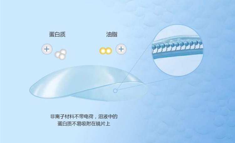 非離子材質是在水凝膠的基礎上加入了大量NVP成分,從而使鏡片輕薄柔軟,不容易產生蛋白質沉澱,一定程度上也提高了美瞳的壽命,解決了一部分水凝膠質地美瞳的缺點,佩戴起來更無感更清透。