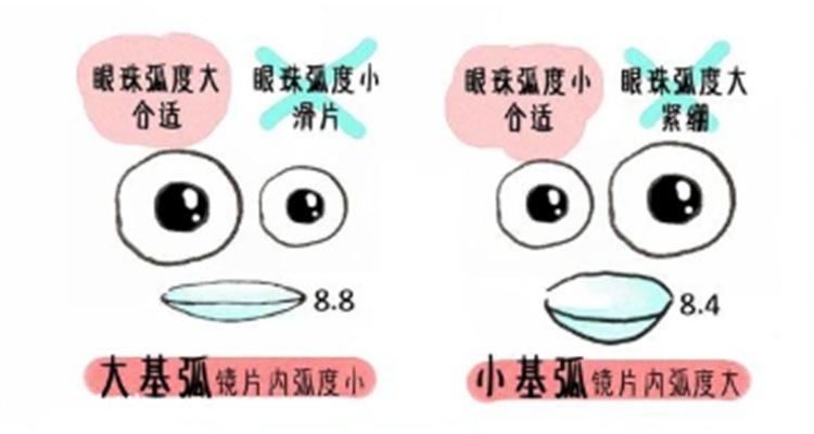 簡單來說把眼球比作腦袋的話,美瞳就像是帽子,基礎弧度就是帽子的大小。太小了會箍的太緊不舒服,太大了又會滑片影響美觀。眼球的大小因人而異,建議大家如果需要長時間佩戴美瞳還是要去眼科醫院測一下你的角膜曲率半徑,就是所謂的眼球基礎弧度。