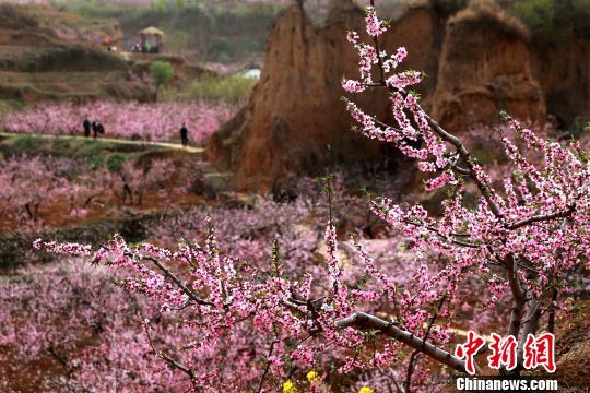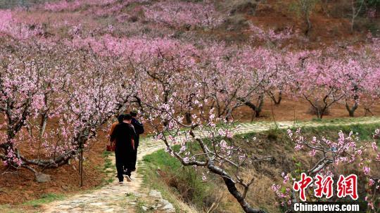 桃花連綿不斷,形成花的海洋,前來賞花旅遊者絡繹不絕。梁犇 攝