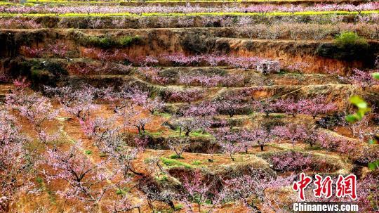 在劉台桃花源景區13公里長的肥桃路兩側,桃樹沿山地地形自然錯落分布,隔而不絕,層次分明。梁犇 攝