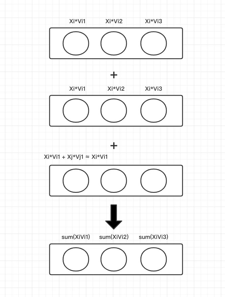 多值離散特徵的 k=3 的每個輸出其實等於 XiVil+XjVjl,因爲他還是同一個 field 的多個特徵值,爲了簡化,我們認爲這個結果近似等於