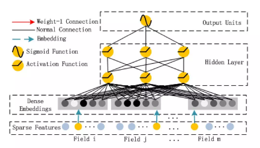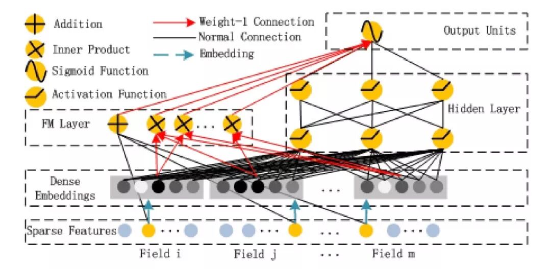 deepFM 說起來結構還是比較簡單,包含了左邊的 FM 和右邊的 deep 部分,每個神經元進行了什麼操作也在圖中表示得很清楚。需要注意的是,圖中的連線有紅線和黑線的區別,紅線表示權重爲 1,黑線表示有需要訓練的權重連線。