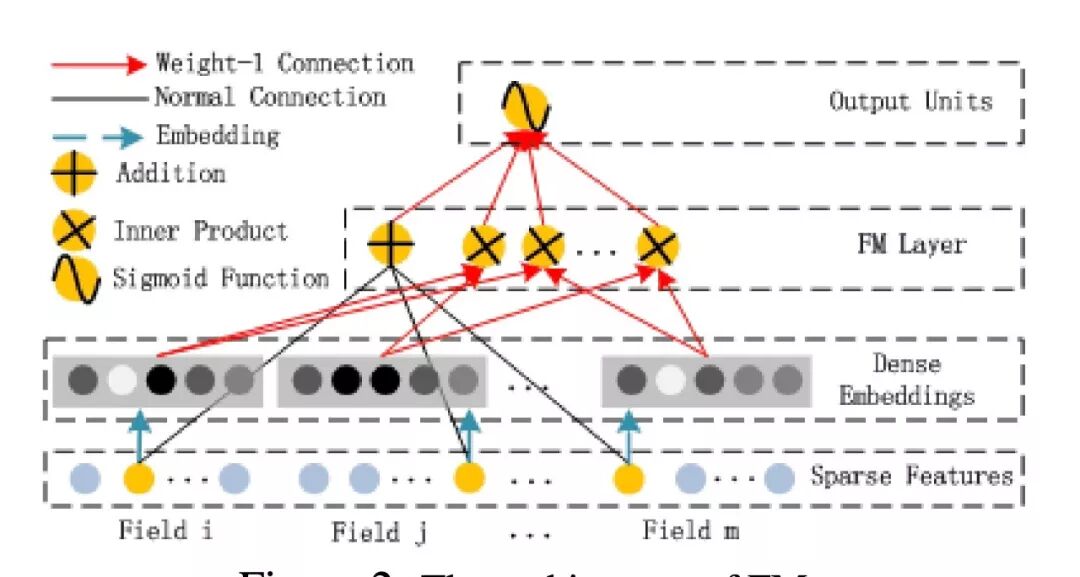 最後第三層到第四層的一次項和二次項通過紅色連線相加,得到最後的 FM 輸出