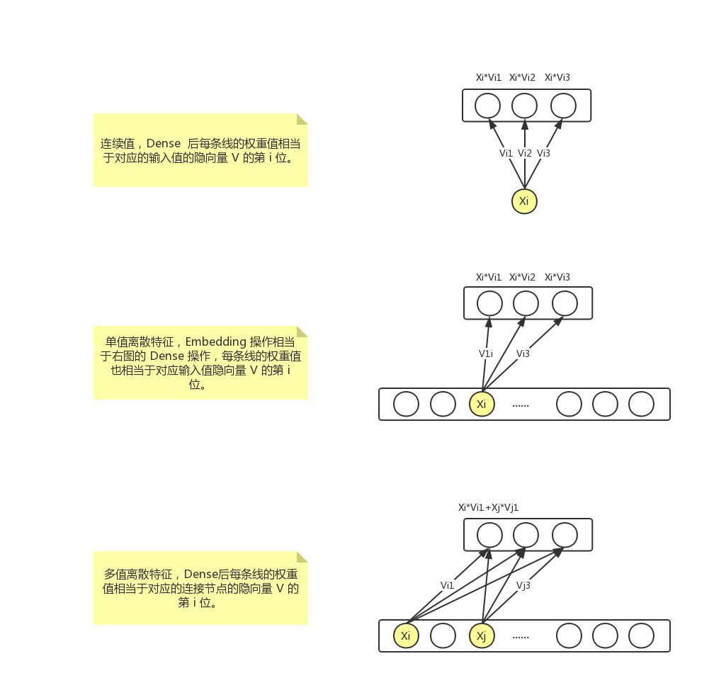這一部分主要做的事情,就是需要得到一個表示各 field 的隱向量,而且不管每個特徵 field 長度是多少,最後得到的隱向量長度都爲 k(這裏 k 由開發者自己指定)。我們來分析一下如何處理這部分。