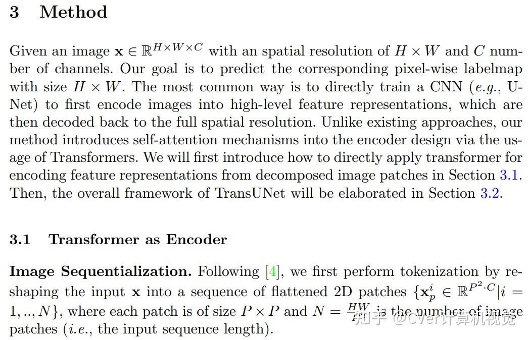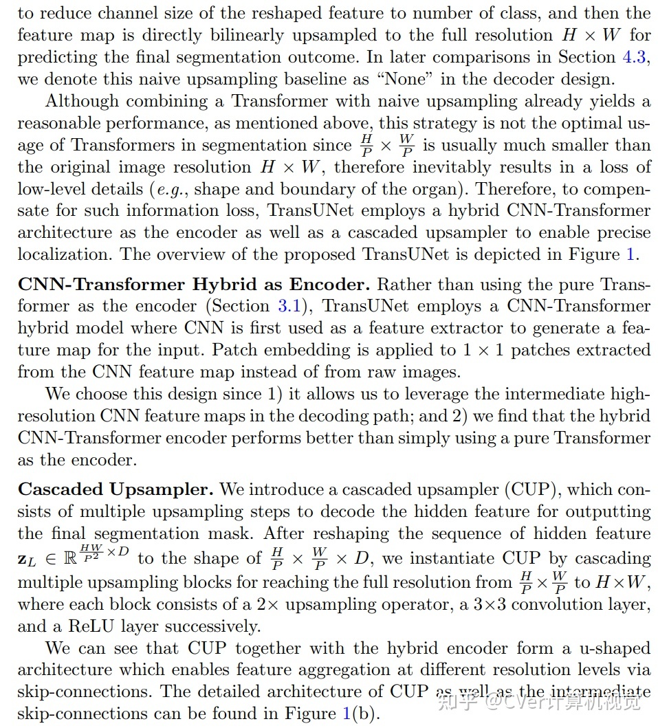 一方面,Transformer將來自卷積神經網絡(CNN)特徵圖的標記化圖像塊編碼爲提取全局上下文的輸入序列。另一方面,解碼器對編碼的特徵進行上採樣,然後將其與高分辨率的CNN特徵圖組合以實現精確的定位。