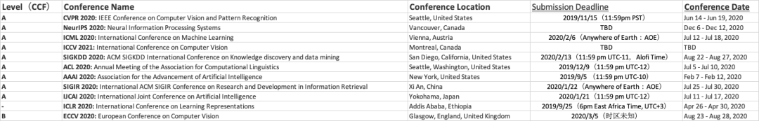 會議舉辦地、舉辦時間和徵稿情況請參考下表(部分頂會未更新最新情況):
